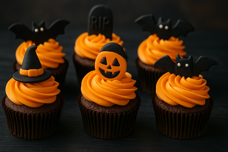 Os cupcakes são versáteis e perfeitos para o Halloween, pois podem ser decorados de inúmeras maneiras: teias de aranha de chocolate, mini monstros de pasta americana, olhos de açúcar e fantasmas de chantilly.