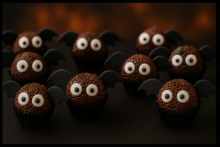 Leve o leite condensado, o creme de leite, a manteiga e o chocolate em pó ao fogo médio, mexendo até desgrudar do fundo. Deixe esfriar, enrole bolinhas, decore com olhinhos de açúcar e posicione pequenas asas de papel ou pasta de chocolate para completar o visual de morceguinho.